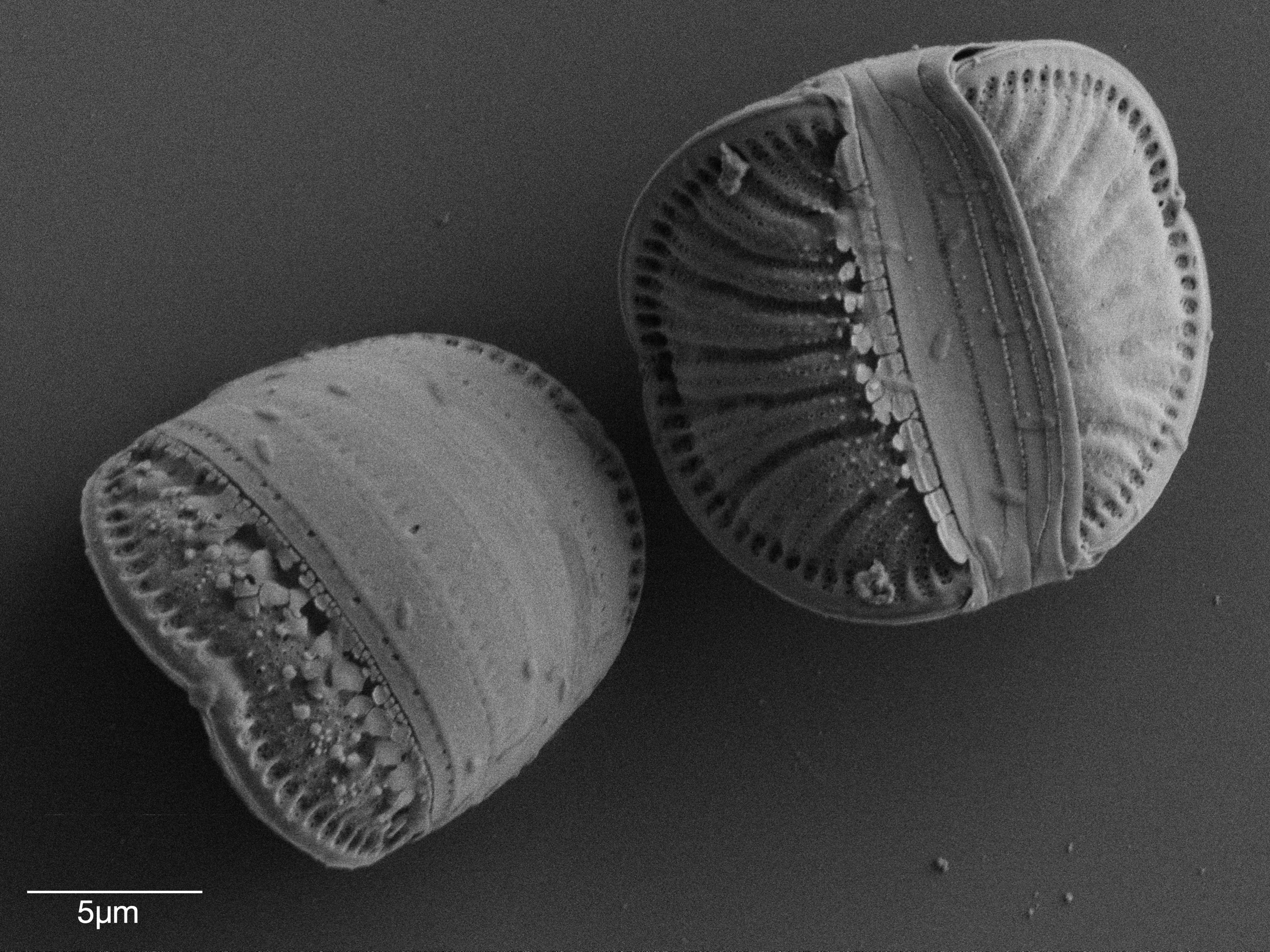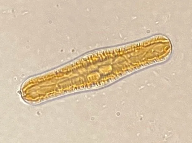 Light microscope image of rhopalodia gibba. Two ‘Spheroid body’ cyanobacterial endosymbionts can be seen in the center of the cell.