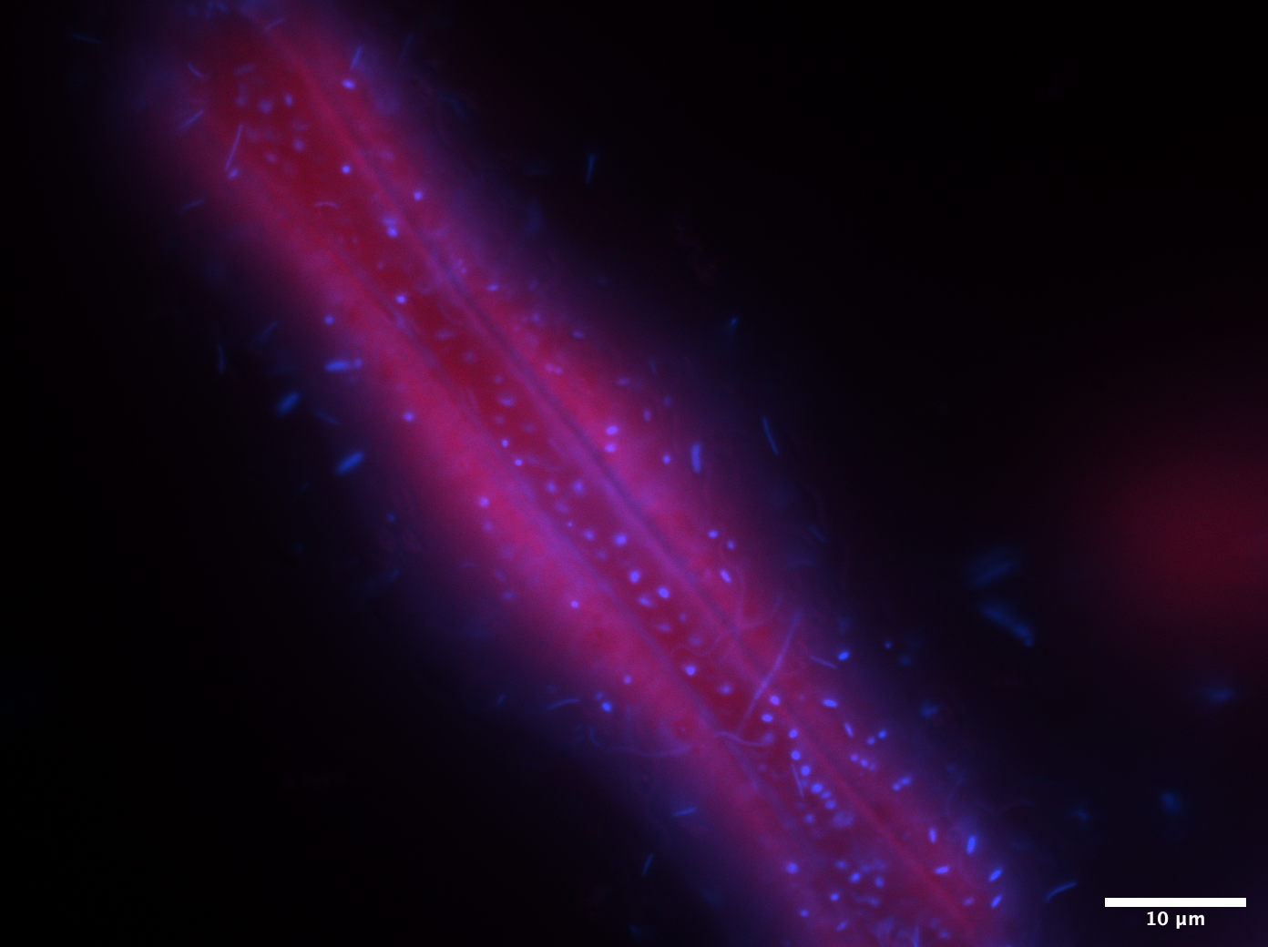 Composite fluorescent image showing chlorophyll auto-fluorescence and DAPI staining. The focal plain is at the bottom face of the cell, revealing the bacterial community associating with the diatom.