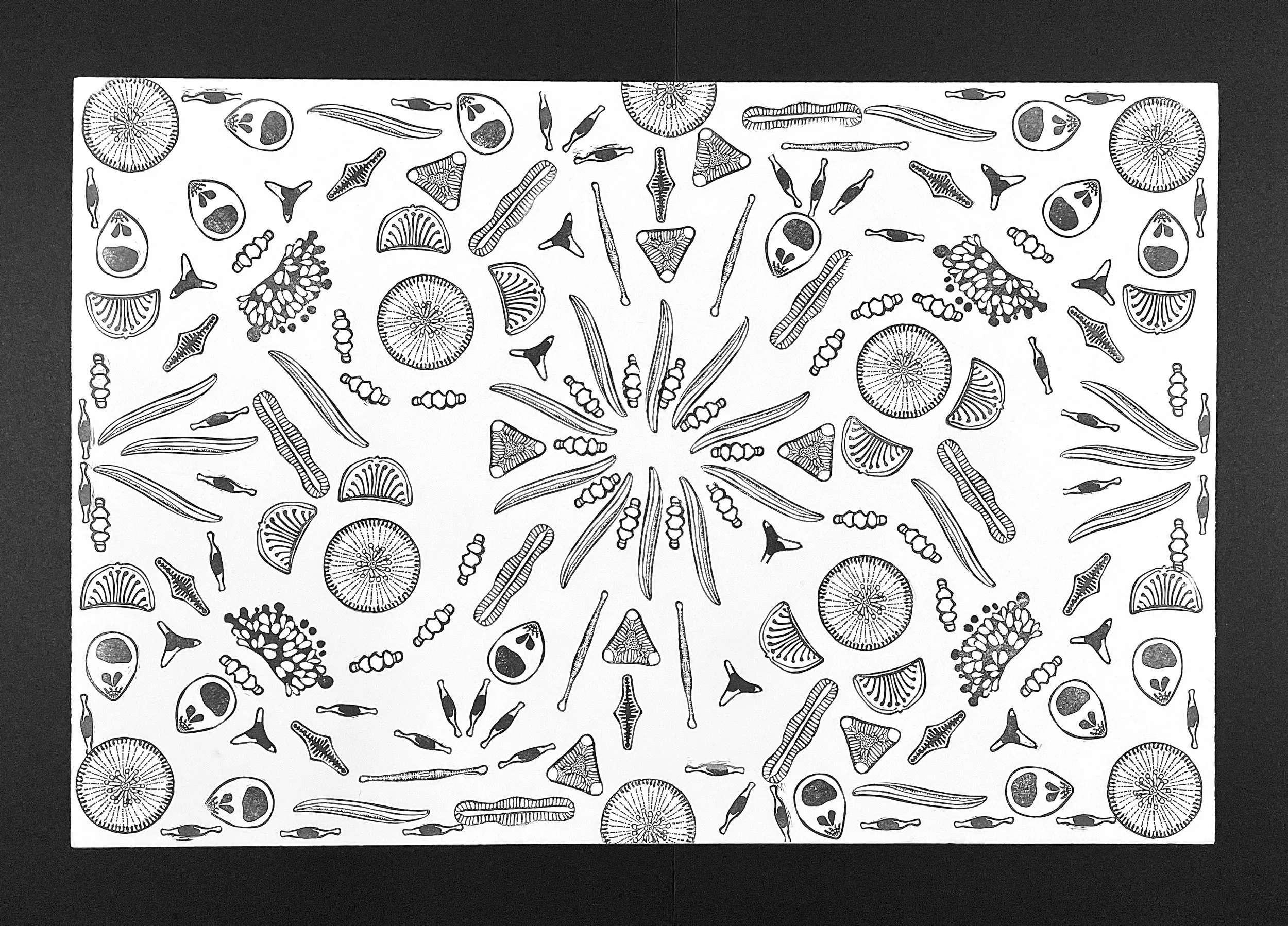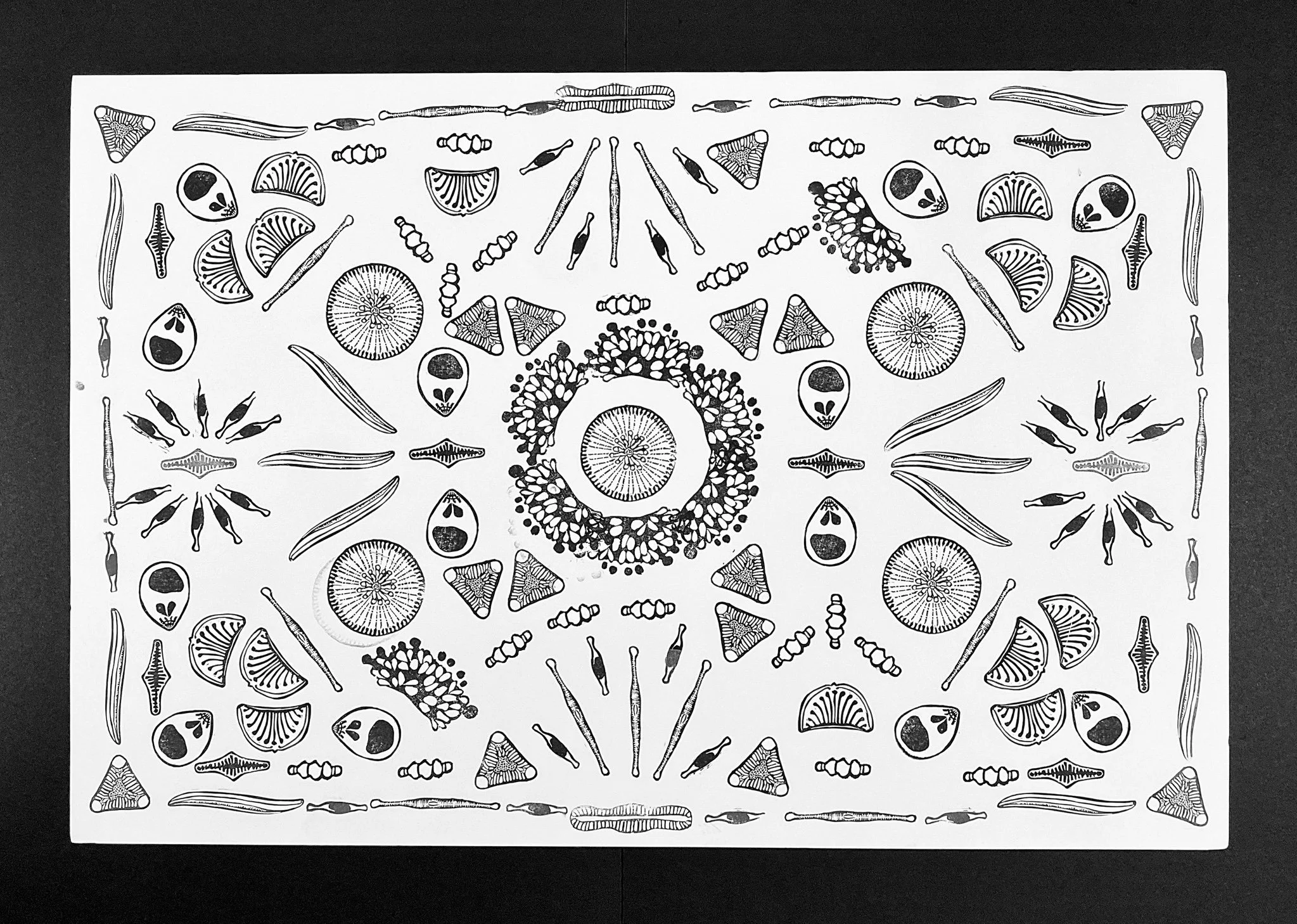Composite fluorescent image showing chlorophyll auto-fluorescence and DAPI staining. When focused on the surface of the diatom cell, light refracts through the silica shell and results in a DAPI glow and shadows created by thicker features in the silica shell appear.